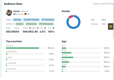 Cyrad is a German creator specializing in Gaming, Content Creation, and PC Hardware. His audience includes gamers, influencers, and PC enthusiasts who connect with his authentic approach to technology and performance-driven content. Cyradโs videos reflect his passion for gaming and hardware innovation, offering viewers engaging, informative, and inspiring insights into the world of PC and tech.